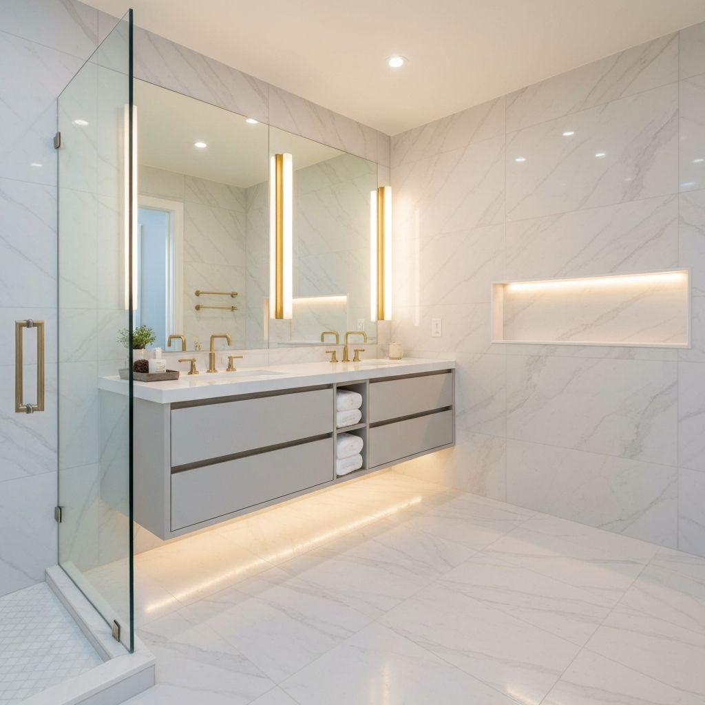 Complete bathroom transformations from floors to shower surrounds, custom niches, and accent walls.